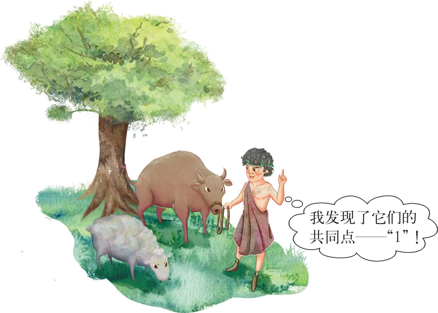 公元前4000年前后,人们逐渐意识到一只羊、一头牛、一棵树……它们之间存在某种共通的 抽象 性质,这就是 数 。这时,记数的情况发生了改变,数字获得了属于自己的符号。表示“5只羊”时,人们不再使用5个表示羊的符号,而是写一个表示数字“5”的符号,然后再画上一个表示羊的符号;表示“5头牛”只需要把羊的符号换成牛的符号就可以了,而数字符号保持不变。从此,数字具有了抽象性。