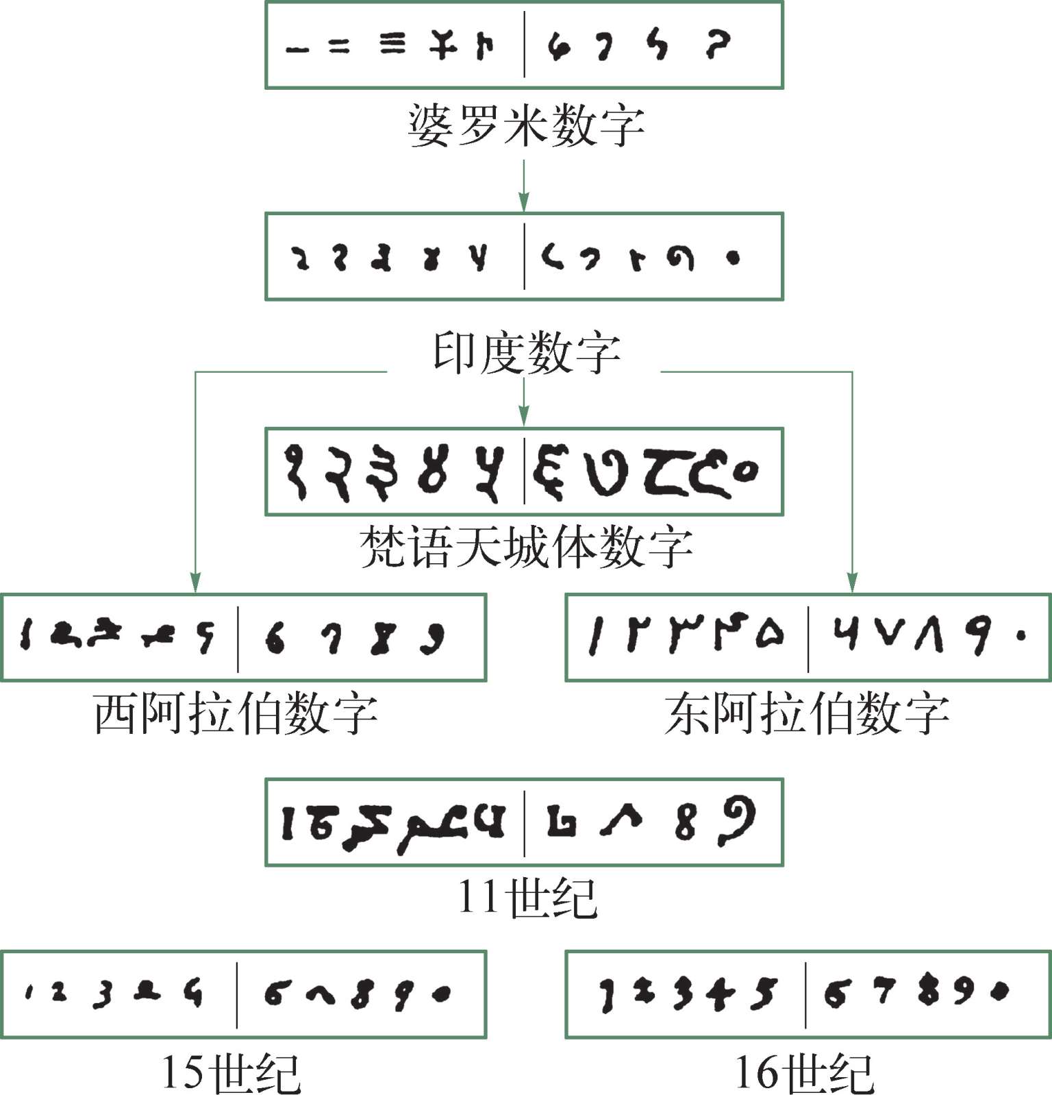 公元前3世纪,印度人开始广泛使用婆罗米数字。5世纪,婆罗米数字已演变为较完善的十进位值制记数法。这种记数法对人类数字文明的发展意义重大:一方面,这些数字符号表达简洁,易于书写和辨别;另一方面,便于产生高效的运算方法。8世纪,它们通过印度的外交使节被带到巴格达宫廷;到了11世纪,在阿拉伯帝国境内,印度记数法得到了普及,从宫廷天文学家到市场的商贩都使用这种数字来解决各种数学问题。在中世纪,由于记数符号的不同,阿拉伯数字分为东阿拉伯数字和西阿拉伯数字。