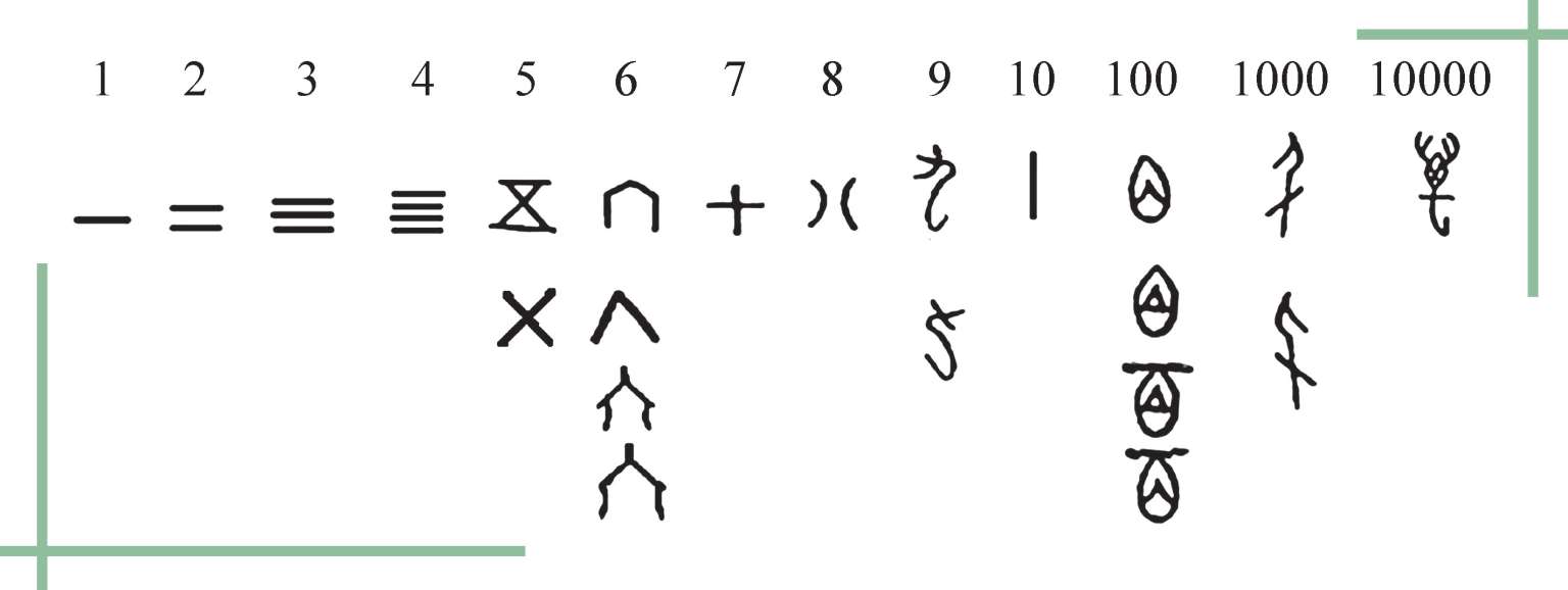 殷商的 甲骨文 已使用十进制记数法,从最小的基数1起到10,及100,1 000,10000都有专门的符号。利用这13个符号,可以表示100000以内的任意自然数。
