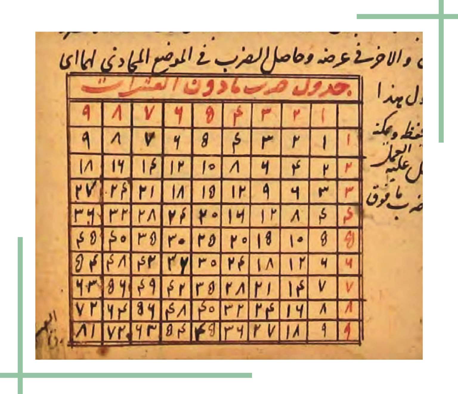 由于汉语“一字一音”的发音特点,我国的九九表读起来朗朗上口、利于记诵,因此发展出了数学基础教育中的“乘法口诀”。然而,九九表并非中国独有。例如,阿拉伯人采用了印度传入的十进位值制记数法,因此也可以找到与我国类似的九九表。从12世纪开始,大量的阿拉伯数学成就开始逐渐传入欧洲,九九表在欧洲数学书中也大量存在。