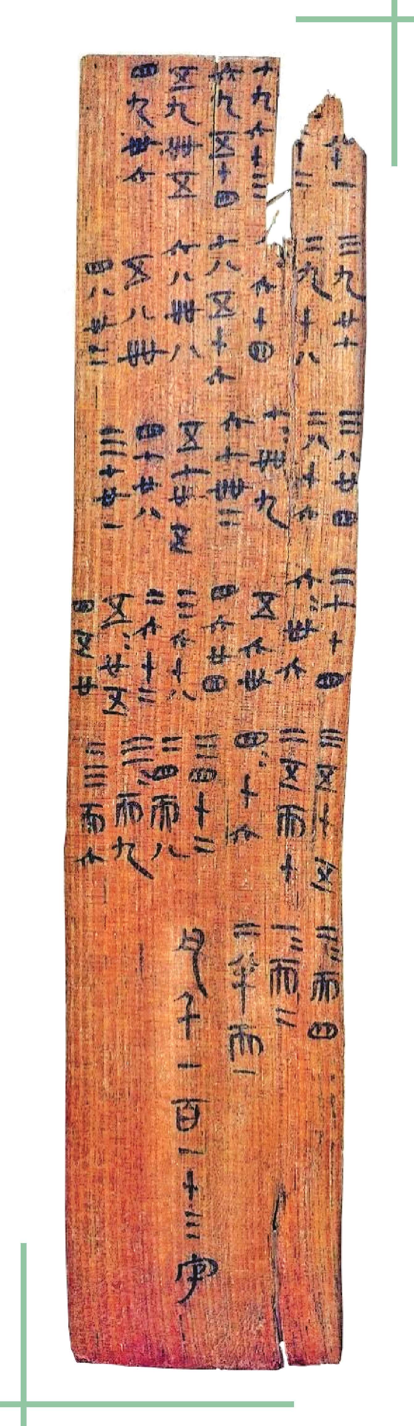 两枚里耶秦简上抄存了3则相当完整的九九乘法表,距今已有2200多年。里耶秦简九九表从“九九八十一”起,到“二二而四”止,只有36句。与今天相比,缺少“一九而九”“一八而八”等9句;同时多出了“一一而二”(1+1=2)、“二半而一”