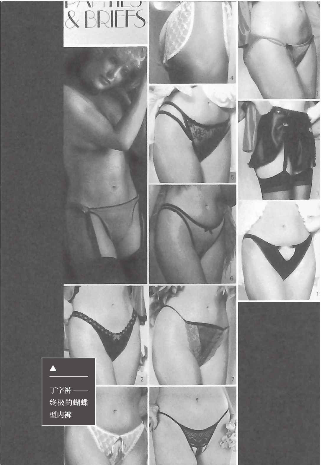 蝴蝶型内裤的意义并非在于其机能性,而在于其象征性。脱衣舞就是让脱衣舞娘依照男性对女性身体的幻想进行表演。而这幻想的核心当然就是女性性器官,所以脱衣舞通常会先绕着这个圈圈打转,最后再一球进入圆心。在那极具挑逗意味的表演中,最后才褪去的小布块,就是蝴蝶型内裤。换句话说,内裤是隐藏最后高潮的东西,也是为了褪去而隐藏的装置。想来想去,内裤的起源似乎也只有这个了。如果不这么想的话,那么从灯笼裤型的内裤发展到现今样式的内裤,其中的变化也太大了。