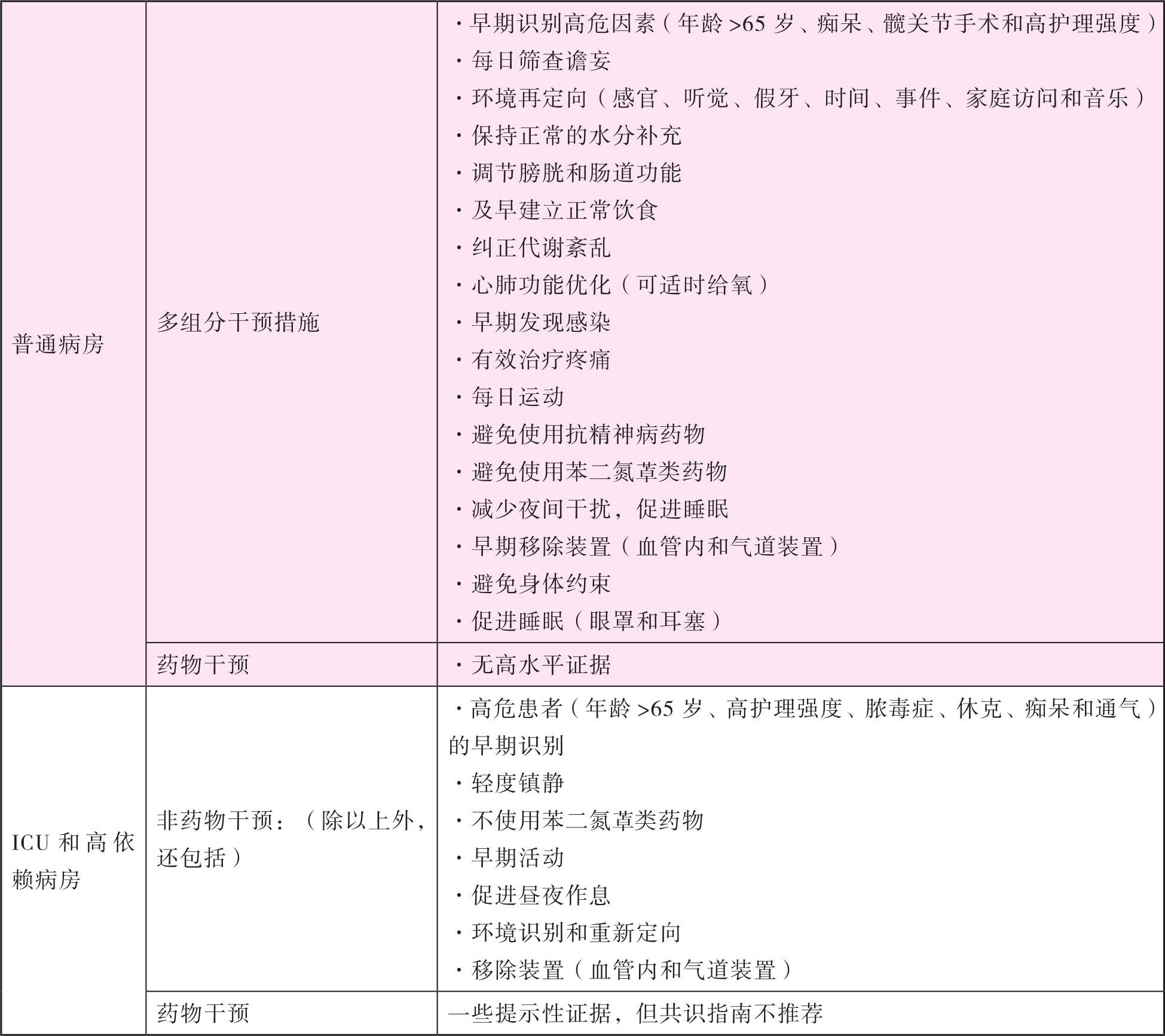 有循证证据表明,多组分干预措施可以降低高危医院住院患者发生谵妄的风险。干预方案因研究而异,包括物理治疗、重新定向、认知刺激、早期活动、非药物促进睡眠、纠正感觉障碍、识别和治疗潜在原因或术后并发症、疼痛管理、避免便秘、防止脱水、加强营养和改善供氧等内容。