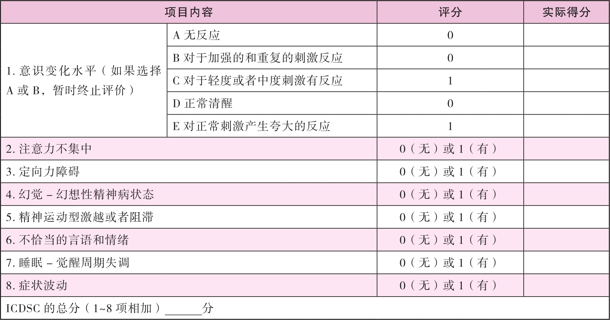 ICDSC操作简便易实施,可将其纳入护士的日常工作中。ICDSC总分≥4时,诊断谵妄的敏感性可高达99%;但特异性较低,仅为64%。ICDSC评估过程中主观性较强,因其中有对患者言语能力的评估,故对气管插管或机械通气患者具有一定的局限性(表5-3-5)。