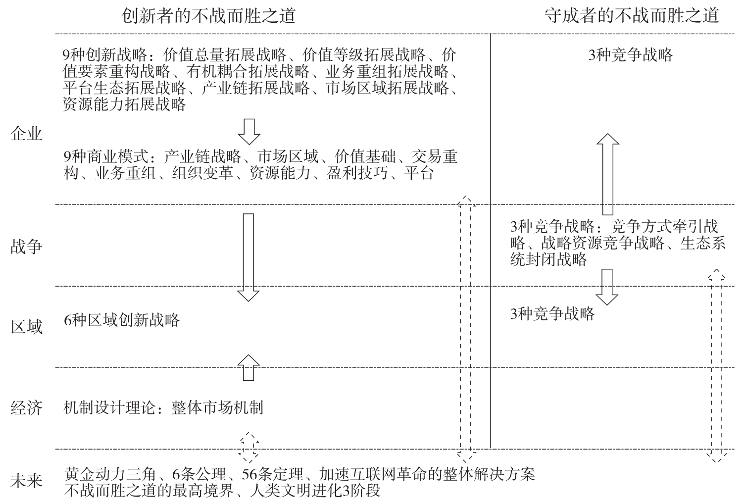 企业创新战略、企业商业模式之间可以相互推导、借鉴与融合。利用企业创新战略、企业商业模式归纳创新者的不战而胜之道,进而利用创新者的不战而胜之道推导区域创新战略,再推导经济机制设计理论,以支持创新战略。以战争归纳守成者的不战而胜之道及3种竞争战略,进而推导企业及区域层面的竞争战略。
