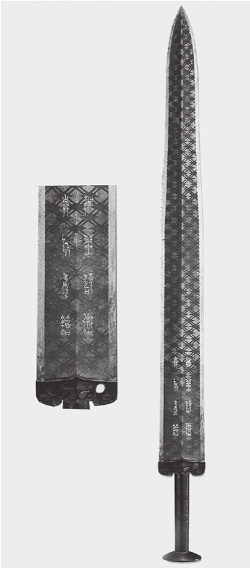 剑身满饰黑色菱形几何暗花纹,剑格正面和反面分别用蓝色琉璃和绿松石镶嵌成美丽的纹饰;剑柄以丝线缠缚,剑首铸有极其精细的十一道同心圆圈。剑身一面近格处有两行鸟篆铭文“钺(越)王鸠浅(勾践)自乍(作)用