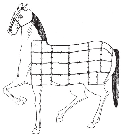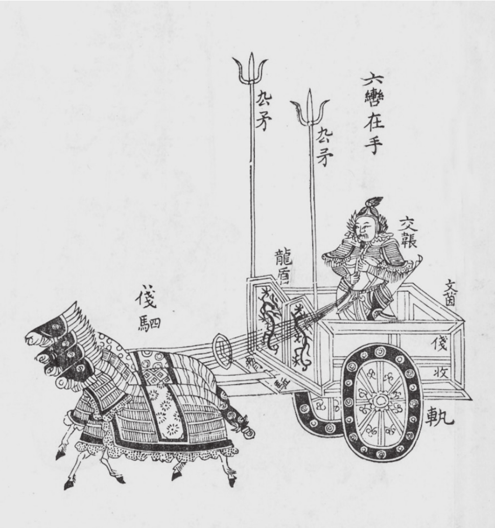 明刊本《武经总要》插图。此图为《诗经·秦风·小戎》诗意图。图中标示了诗中所提到的“ 收”“文茵”“ ”“辔”“厹矛”“交 ”“龙盾”“ 驷”等。