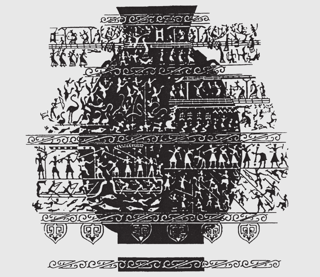 铜壶展开图为水陆攻战的场面,两军对垒,其中有仰攻、投石、舟师对战等。 oa980pE+OiSh4eNSvBumBVuV32gvQOBUHnaSRk4VLDd00ZVMiI/6sDjYtgsA8Kvz