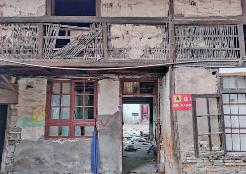 还有几幢房屋的二楼,其楼槛檐的板壁墙,是用毛竹剖成条编成的篱笆墙以代替木板墙。篱笆墙外面用扎断的稻草精和泥巴拌匀成泥浆抹平,外层再用石灰粉刷成白色,这样既省钱又省工时。但上述的这些特点,绝不是当时的常规工艺,而是抗战时期在各种建筑材料、各类工匠都紧缺的情况下,不得不使用这种不是办法的办法。可这种既经济又牢固耐用的结构,除后来人为拆除外,保留至今都完好如初,无形中成了当时创新的工艺。