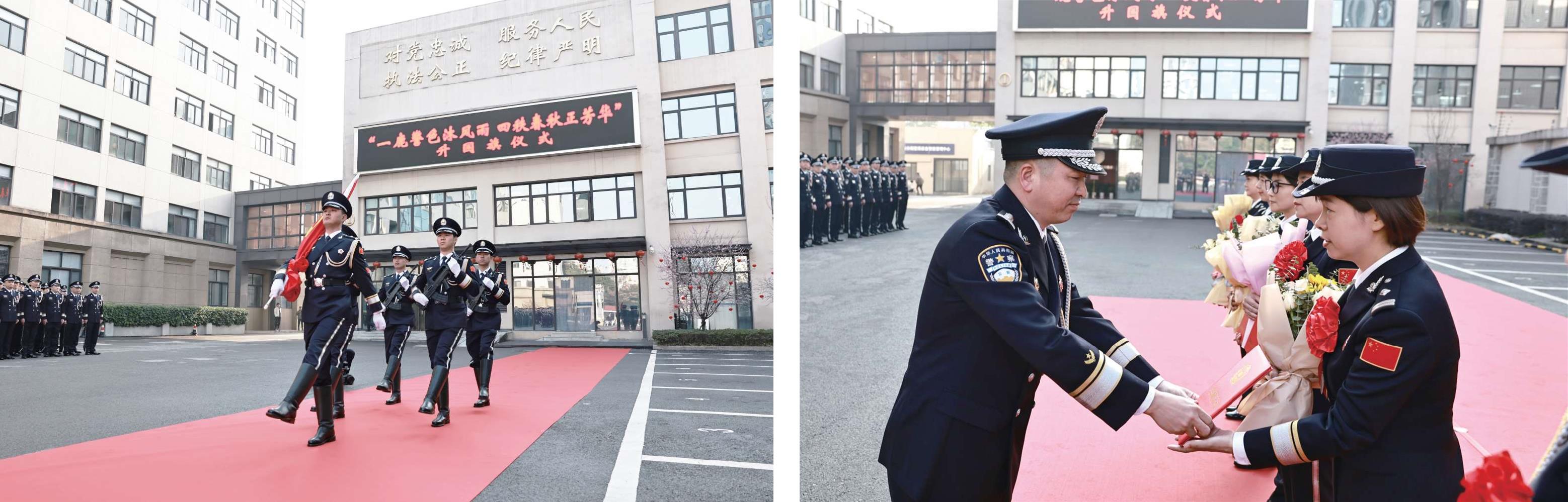 2024年3月12日,分局举行“一鹿警色沐风雨 四秩春秋正芳华”升国旗仪式。右图为副区长、分局局长潘青来(左)为分局获奖民警颁奖