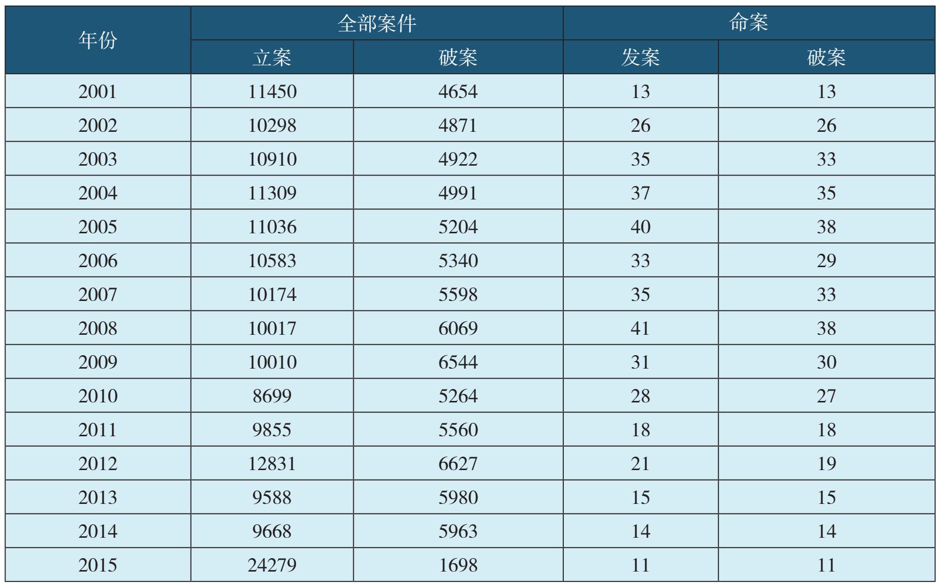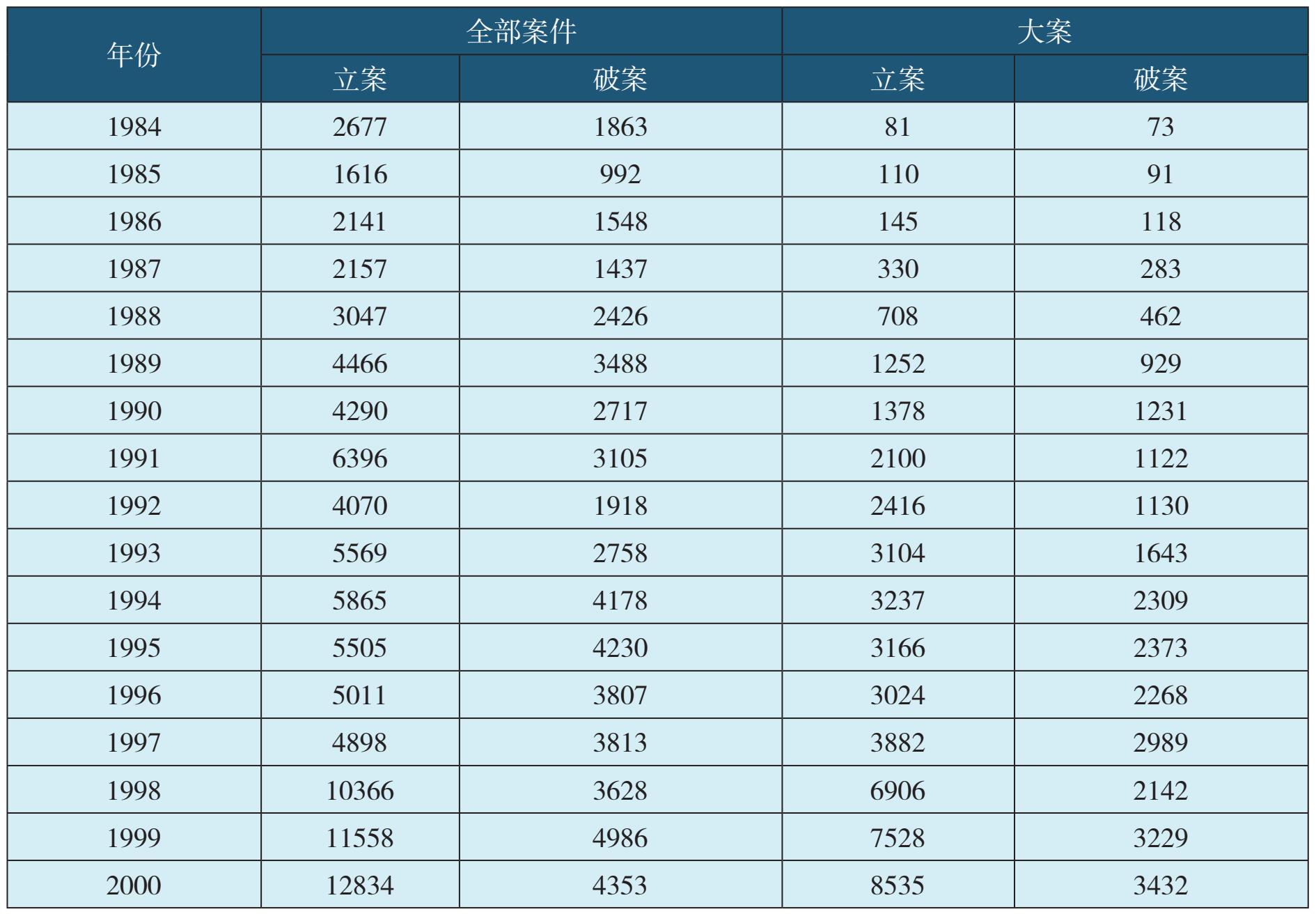 (表格中的大案指杀人、抢劫、强奸、盗窃等案件中影响力较大的案件)
