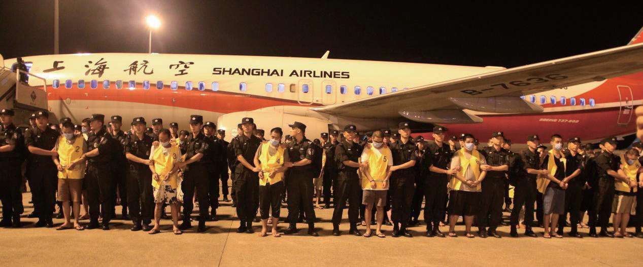 图3-1 2017年8月24日,部督“8·24”马来西亚电信诈骗专案组包机落地温州龙湾机场
