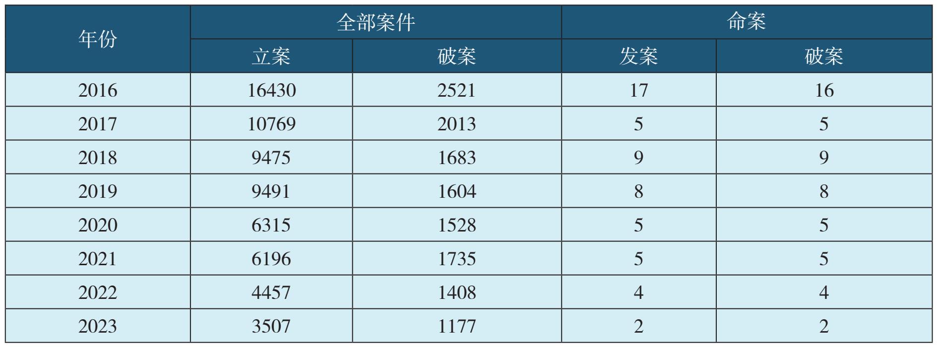 2016—2023年是鹿城区刑事发案的稳步下降期。立案数开始逐年大幅下降,2022年创25年来的历史新低,下降到4457起。其中命案、传统侵财案件下降趋势明显,“五类”案件发案有所波动,但案件恶性程度明显下降。随着新型电信网络诈骗案件高发多发,2019年7月,鹿城区反电信(网络)诈骗中心揭牌成立,刑侦大队组建专班推进打防通讯网络诈骗工作,电信网络诈骗发案开始稳中有降。“两抢”发案数在2021—2023年期间持续下降,治安环境得到有效控制。
