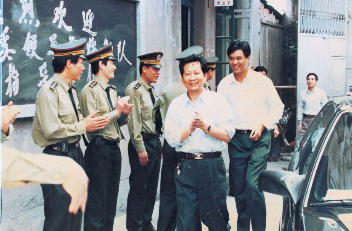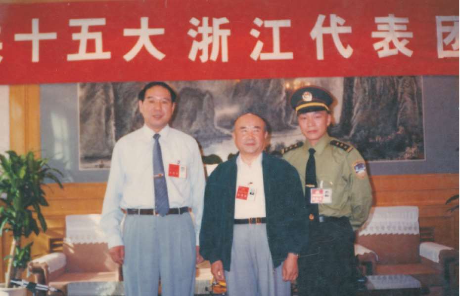 1997年9月13日,省委书记、省人大常委会主任李泽民(中)在中国共产党第十五次代表大会上与分局民警林勇合影