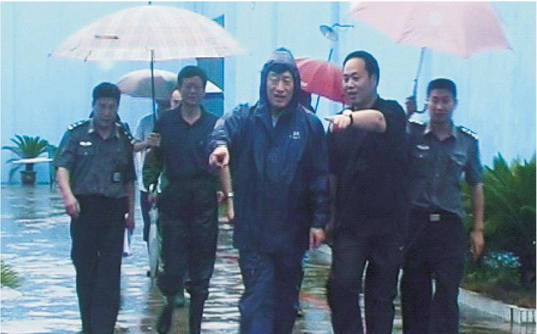 2005年8月5日,市委副书记、市长刘奇(中)检查指导鹿城区看守所抗击台风工作