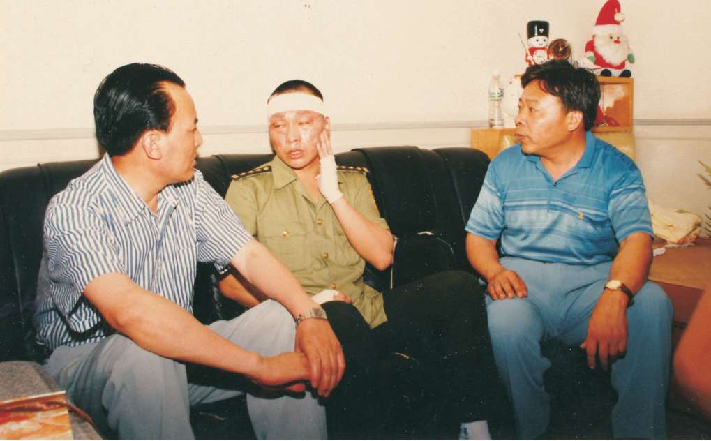 1996年7月3日,市委副书记、市长钱兴中(左一)看望慰问分局受伤民警林勇