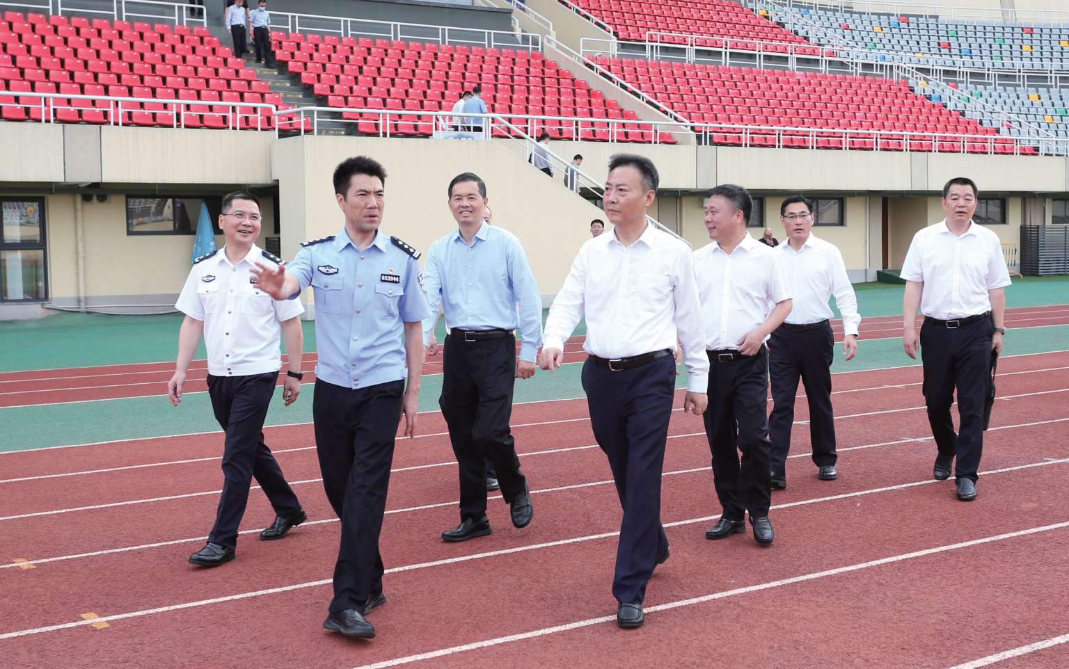 2023年6月5日,副省长、省公安厅厅长杨青玖(右四)在鹿城体育中心调研指导分局亚运安保工作