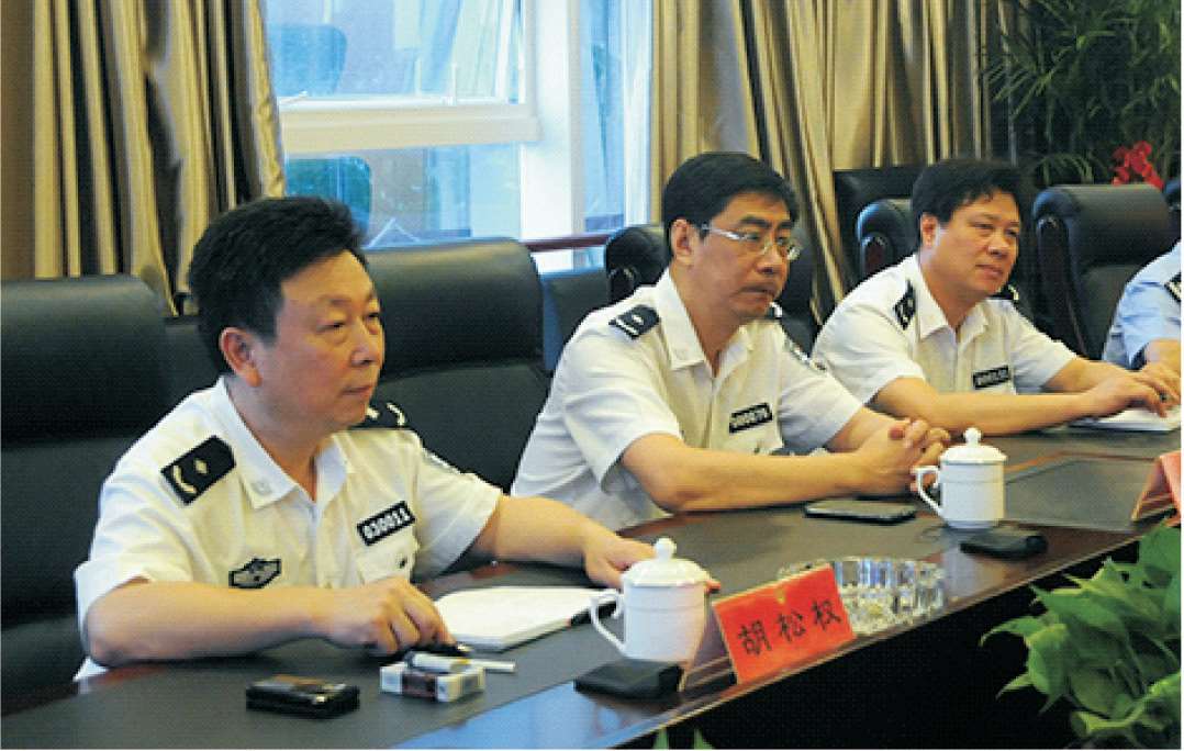 2014年8月26日,公安部二十三局主任黄洪(左三)到分局调研指导情报信息工作