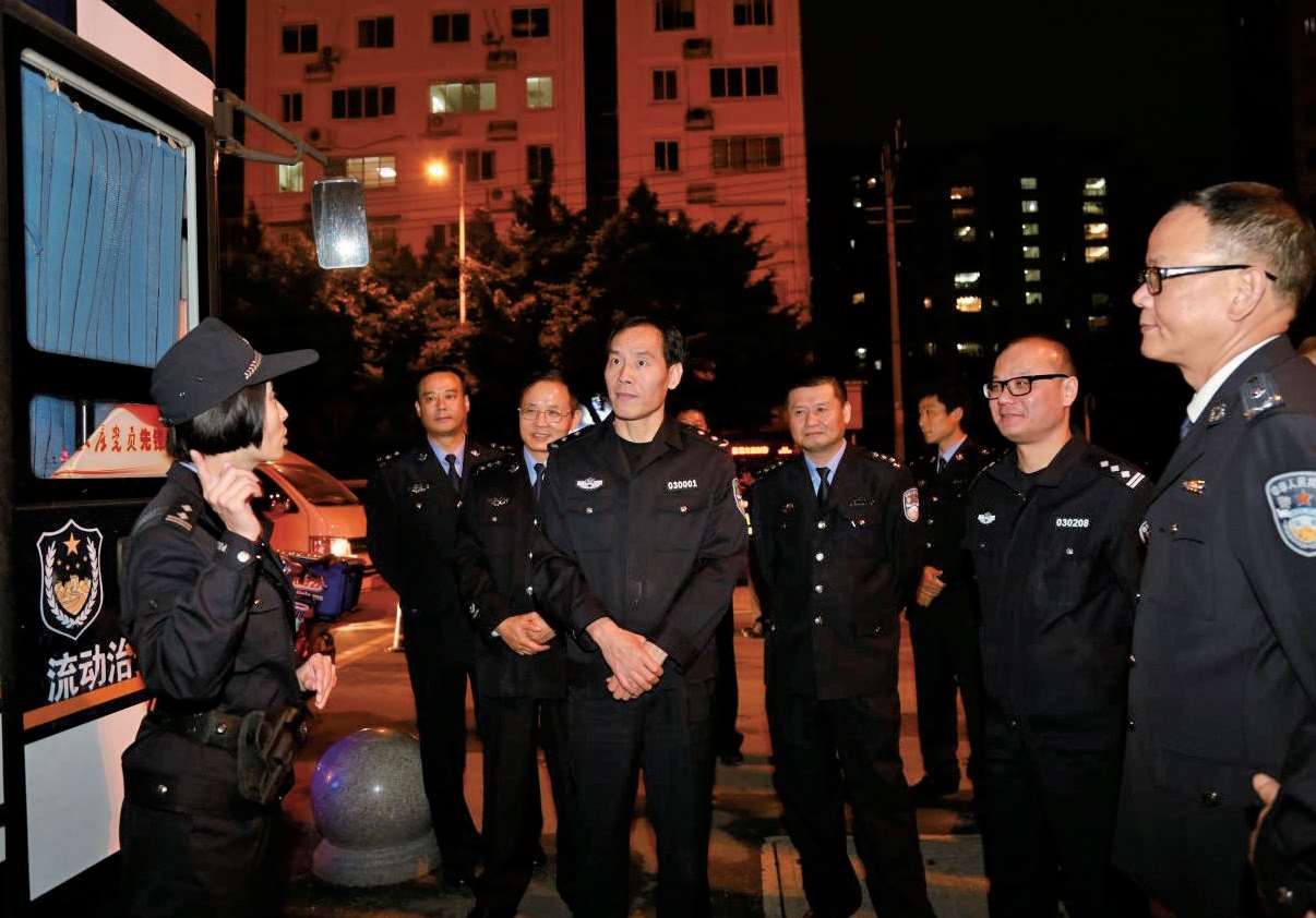2015年11月11日,市委常委、市公安局局长黄宝坤(前排左二)在分局检查指导“警灯工程”岗亭执勤工作并慰问执勤民警