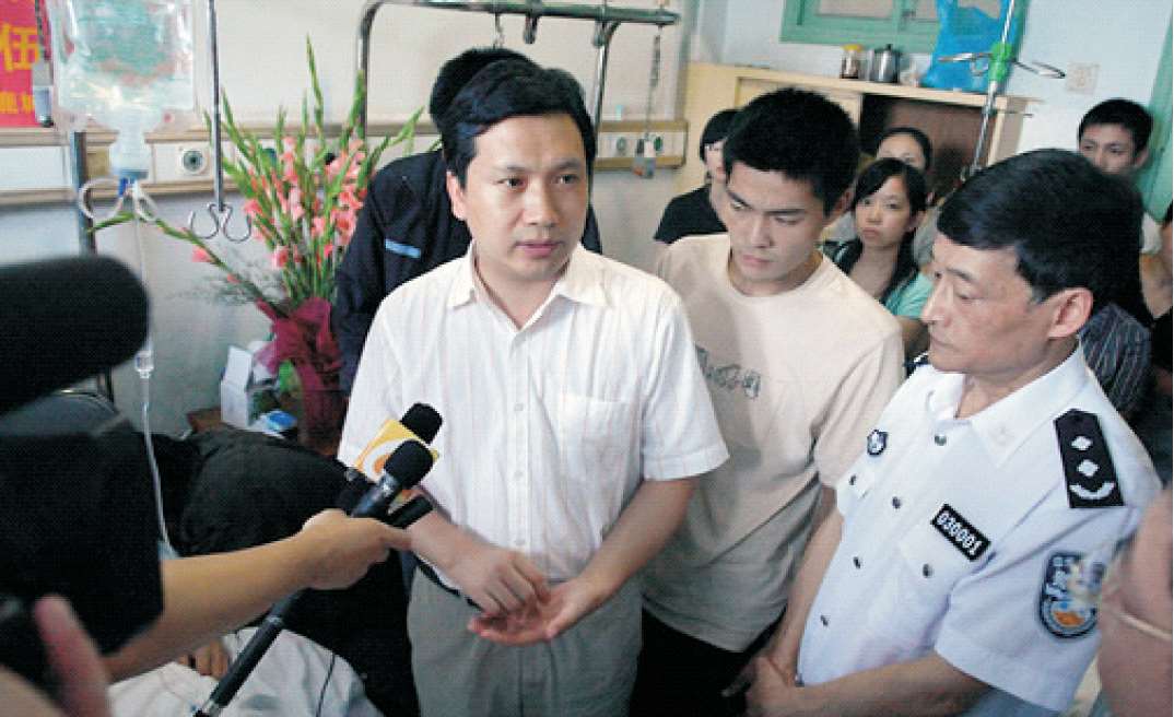 2007年8月14日,市委副书记、政法委书记赵一德(左一)和市委常委、市公安局局长陈石春(右一)看望慰问见义勇为市民