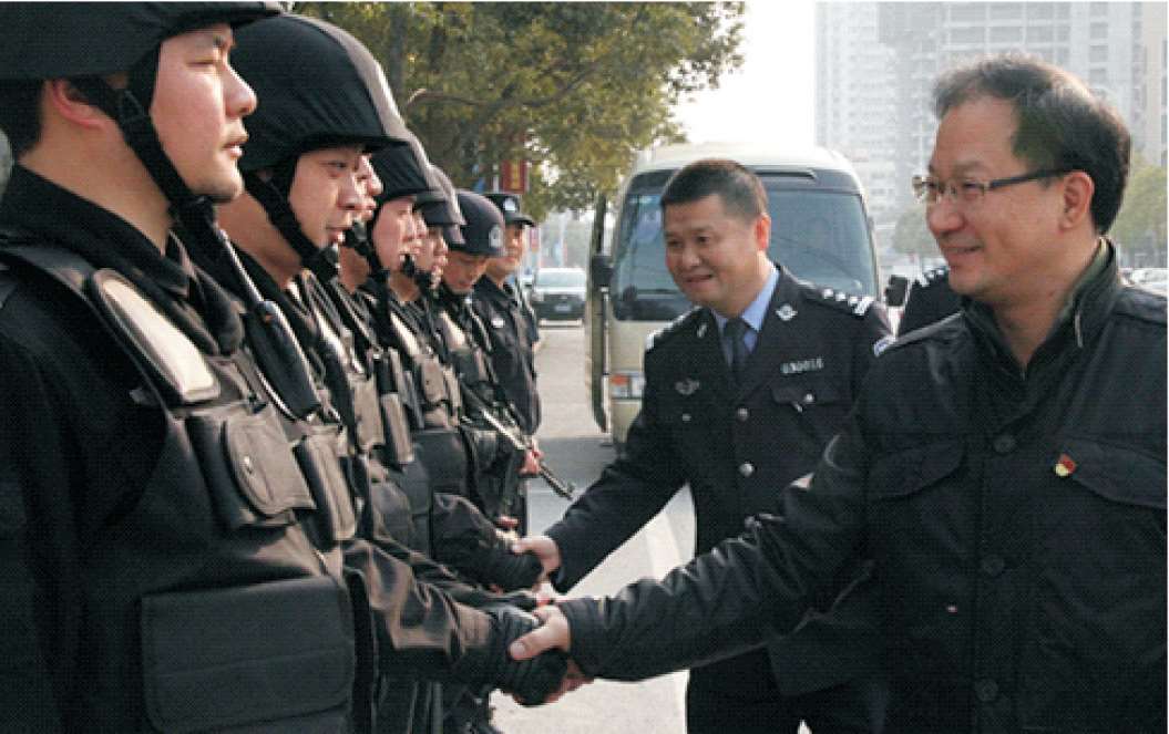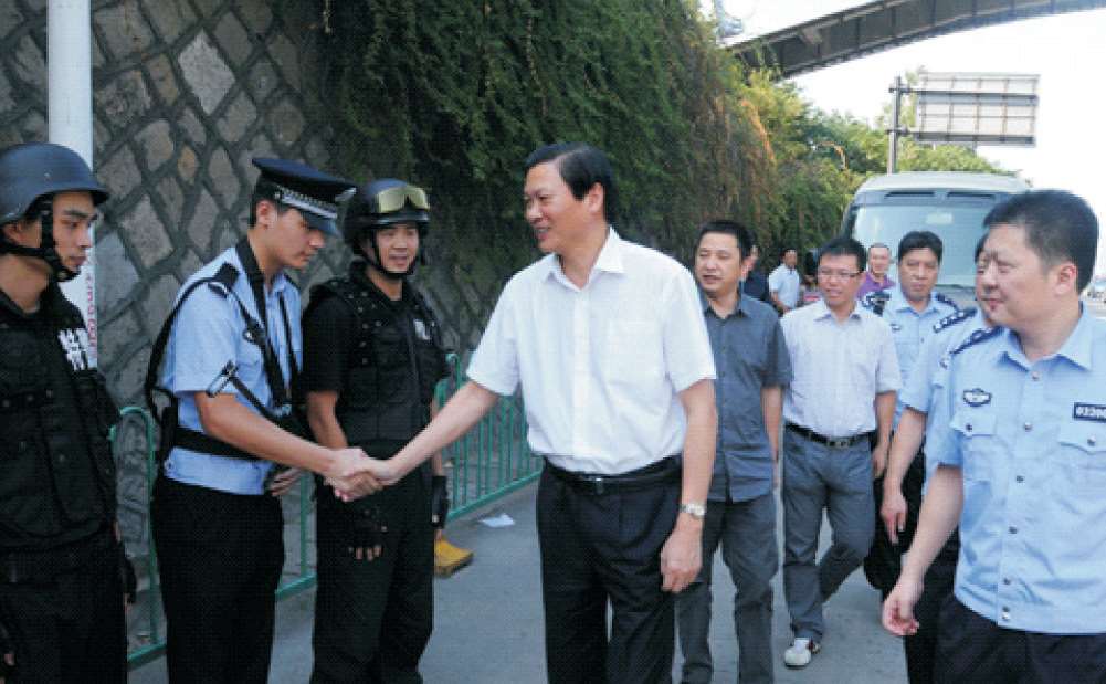 2009年9月25日,市委常委、区委书记余梅生(左四)慰问参加安保工作的分局民警