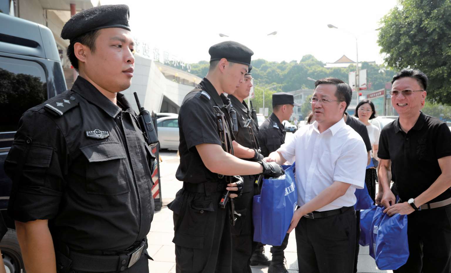 2019年8月7日,区委书记姜景峰(右二)到鞋都大道慰问高温下路面执勤的分局特警