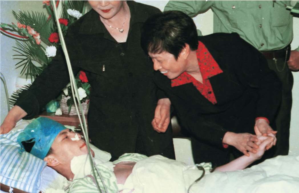 2000年4月10日,市委副书记陈艾华(右一)看望慰问因抓捕持刀抢劫对象负伤的分局民警周扬