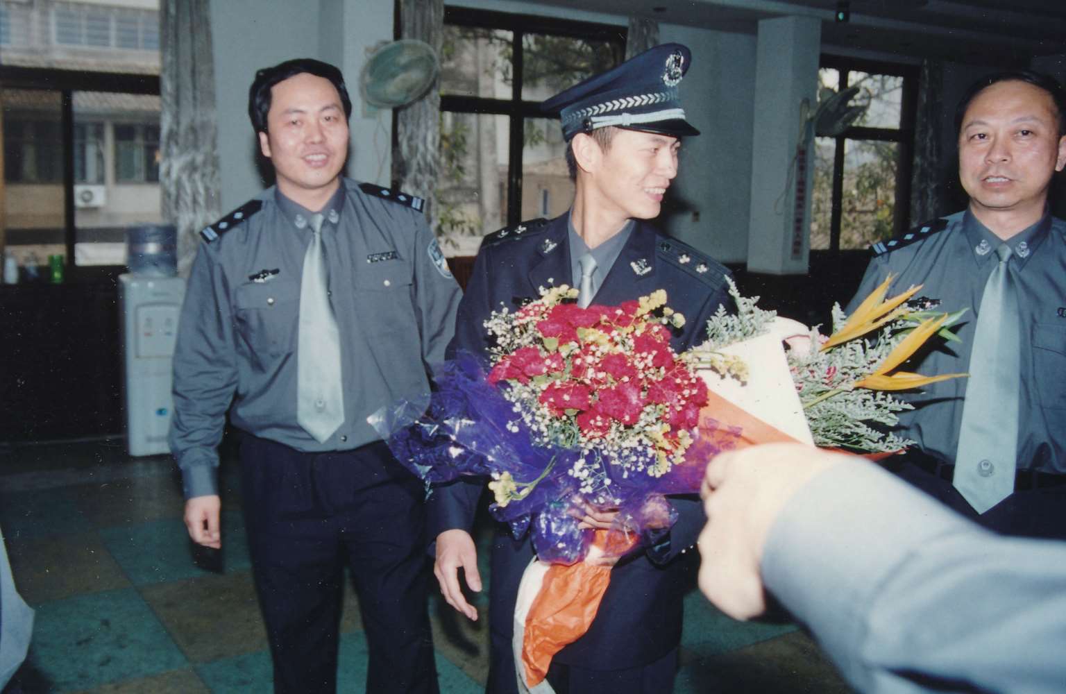 2001年4月30日,区委常委、分局局长李江晖(左一)迎接得到胡锦涛总书记接见后从杭回温的公安英模周扬