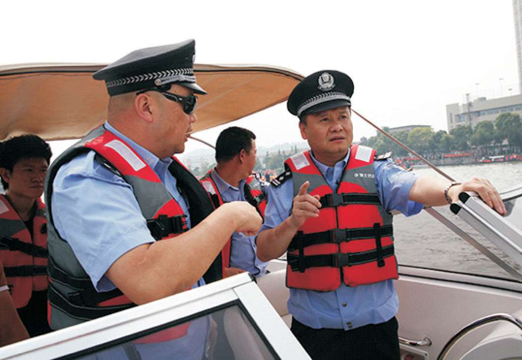 2013年6月12日,市公安局党委委员、区委常委、分局局长金国平(右一)现场督导温州市首届龙舟文化节暨塘河龙舟拉力赛安保工作