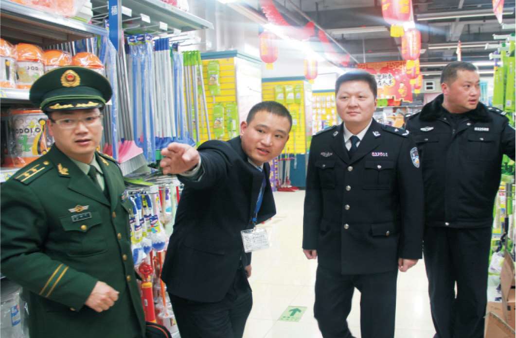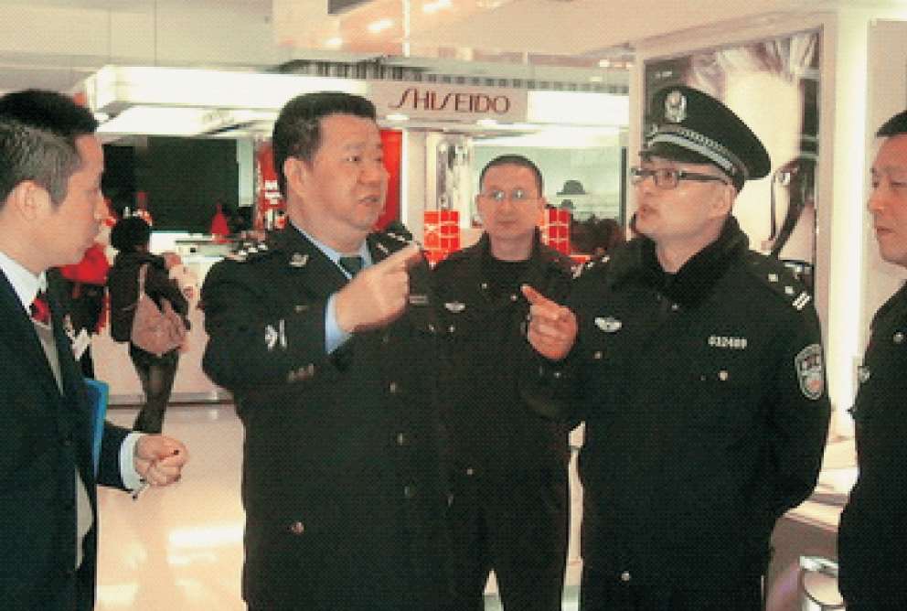 2011年12月25日,分局党委委员、治安一大队大队长徐孟松(左二)检查指导商场消防安全工作