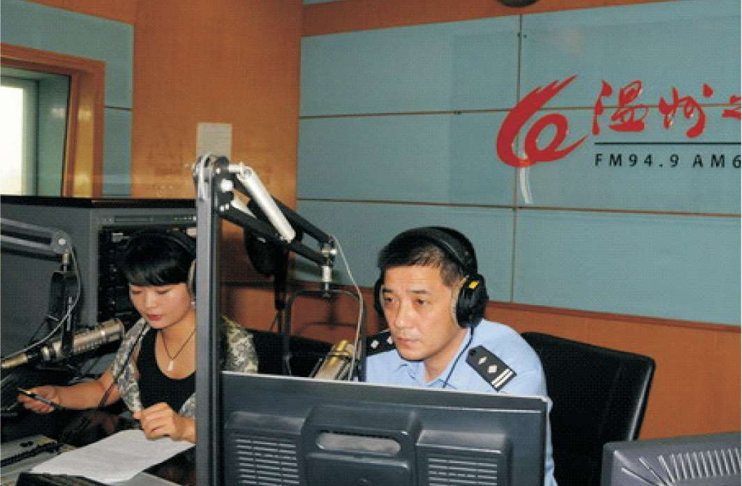 2012年9月12日,分局党委委员、纪委书记、督察长胡茫(右)参加由市局纪委和温州电台联合主办的《警民时时通》栏目直播活动