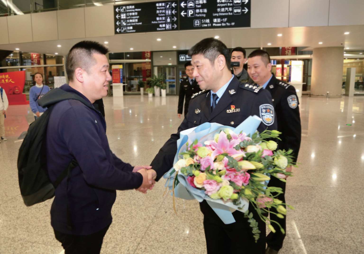 2019年11月19日,分局党委副书记、常务副局长张皓(右)迎接分局赴滇禁毒打击专案组凯旋
