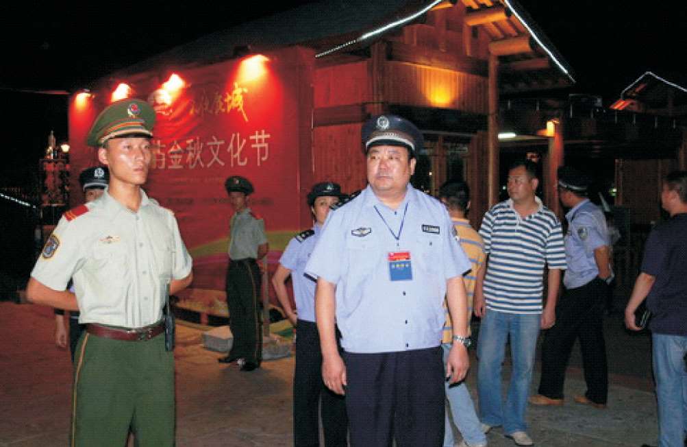 2007年9月30日,分局党委副书记、政委王盛(左二)现场督导金秋文化节大型焰火晚会安保工作