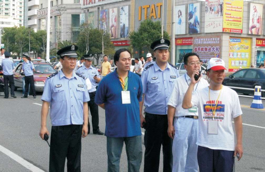 2007年9月27日,市公安局党委委员、区委常委、分局局长李江晖(左二)现场督导2007上海世界夏季特奥会执法人员火炬跑圣火传递活动安保工作