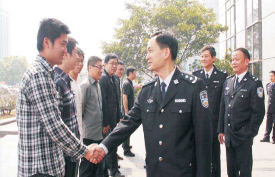 20 1 1年4月1 8日,分局“2011·3·29”特大持枪绑架案专案组民警凯旋。图为市委常委、市公安局局长叶寒冰迎接慰问专案组民警