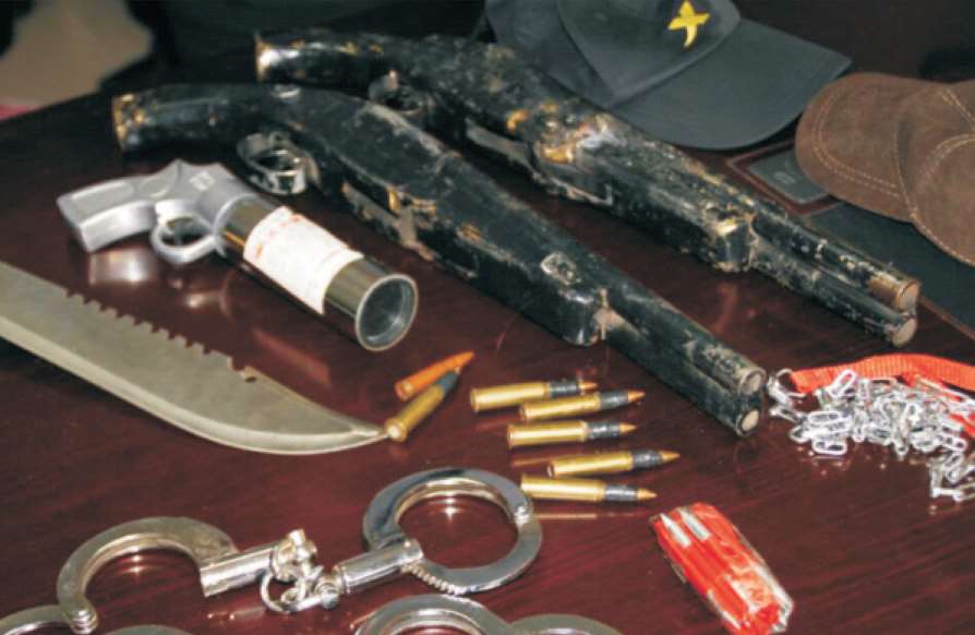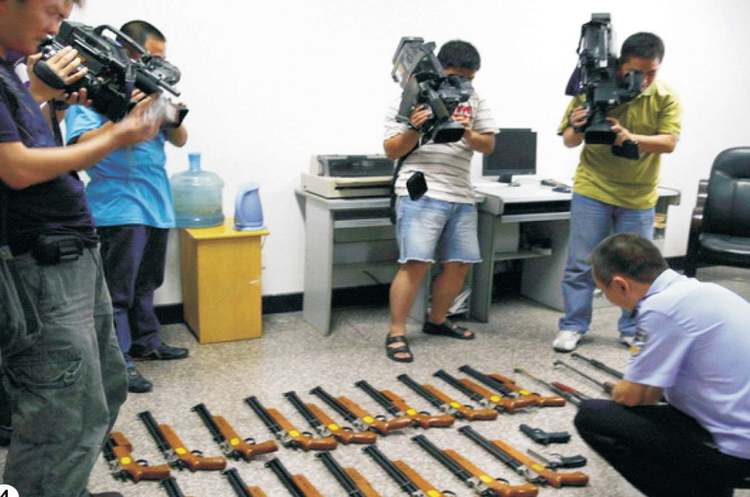 2011年3月29日,3名绑匪在鹿城区江滨路持枪绑架一名驾驶价值500多万“兰博基尼”跑车的妇女,勒索巨额赎金1500万元。分局专案组历经20个昼夜奋战成功侦破此案,抓获犯罪团伙成员3名,缴获枪支4支,追缴赃款292万元。图为缴获的作案工具。