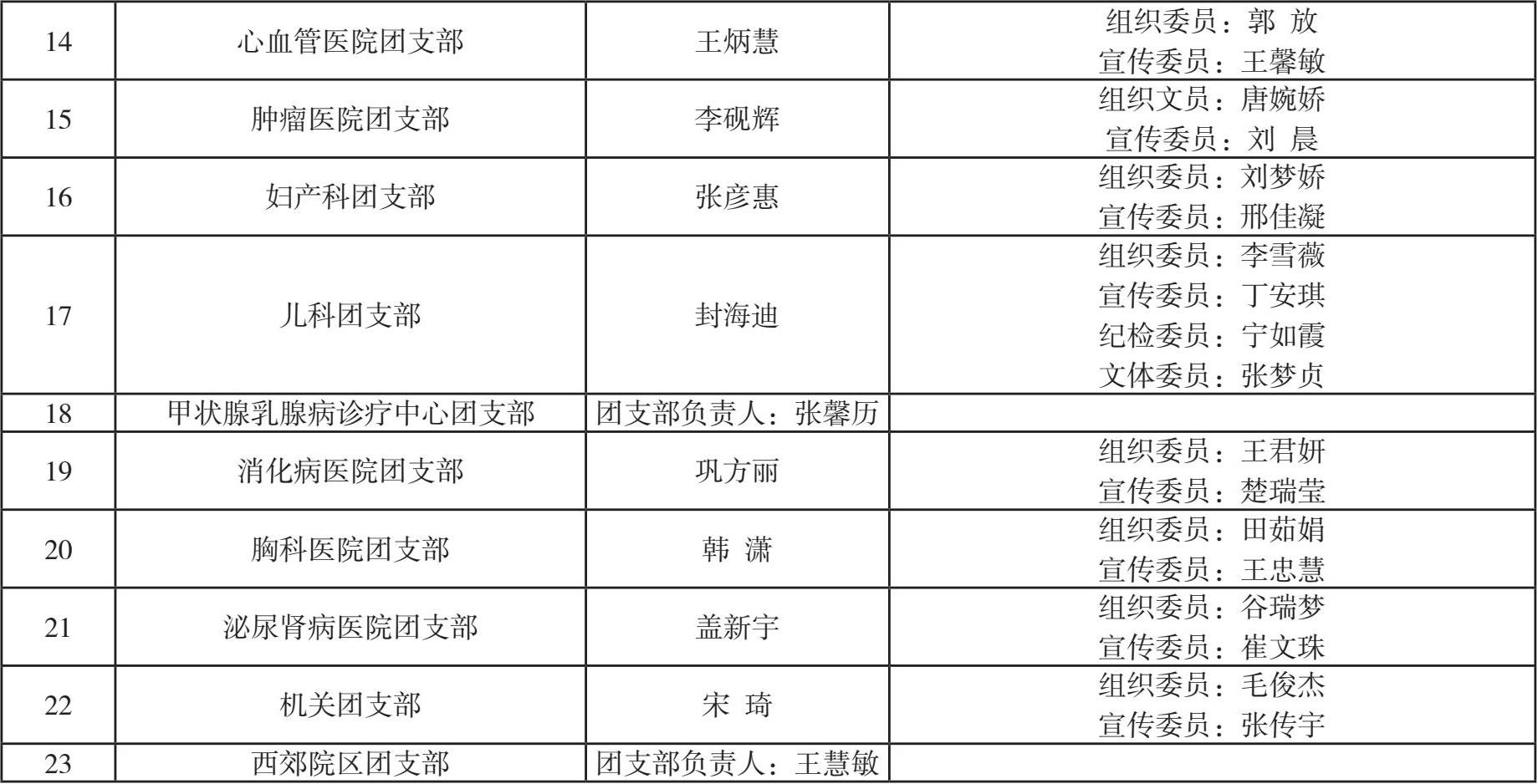 概况 1973 年 4 月,成立共青团胜利油田职工医院委员会,当时与胜利分院是一个团委。2005 年 4 月医院改制后,撤销团委,职能并入党群工作部。2011 年 9 月重新设立团委,隶属党群工作部。2018 年 8 月党政办公室成立后,医院团委隶属党政办公室。2021 年 2 月党委办公室成立后,医院团委隶属党委办公室。截至 2024 年 4 月,医院团委在职人数 2 人,其中大学学历 2 人,高级职称 1 人、中级职称 1 人。