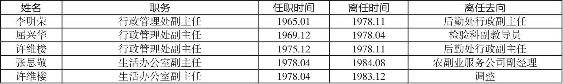 1984 年,后勤处分为综合公司、食堂科、农副业公司三个单位。综合公司现有职工 206 人,30 多个工种,负责汽车队、维修队、托儿所、供应站、基建组及办公室等业务工作。
