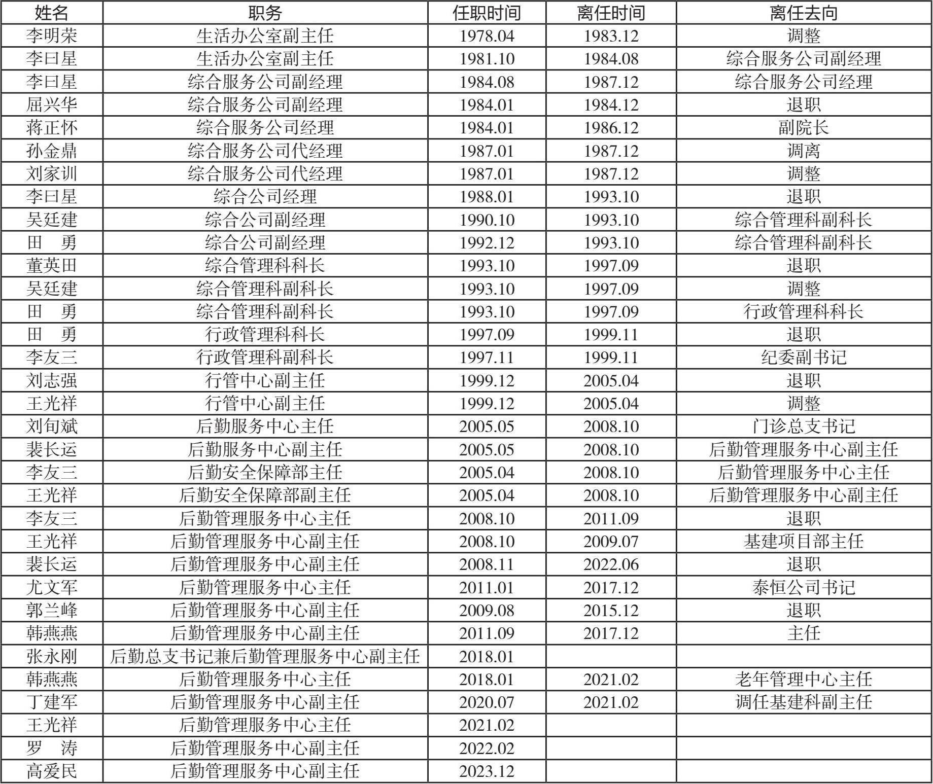 2000 年,综合服务大队撤销,后勤综合科名称取消,成立院直属行政管理中心。后勤工作由行政管理中心负责,下设一个四级单位病房综合服务队,科室有职工 43 人,担负医院的安全、机动、节能、环保、绿化、保洁、房产、土地、维修管理工作以及水电气暖氧负压运行、电梯、污水处置等服务保障工作。