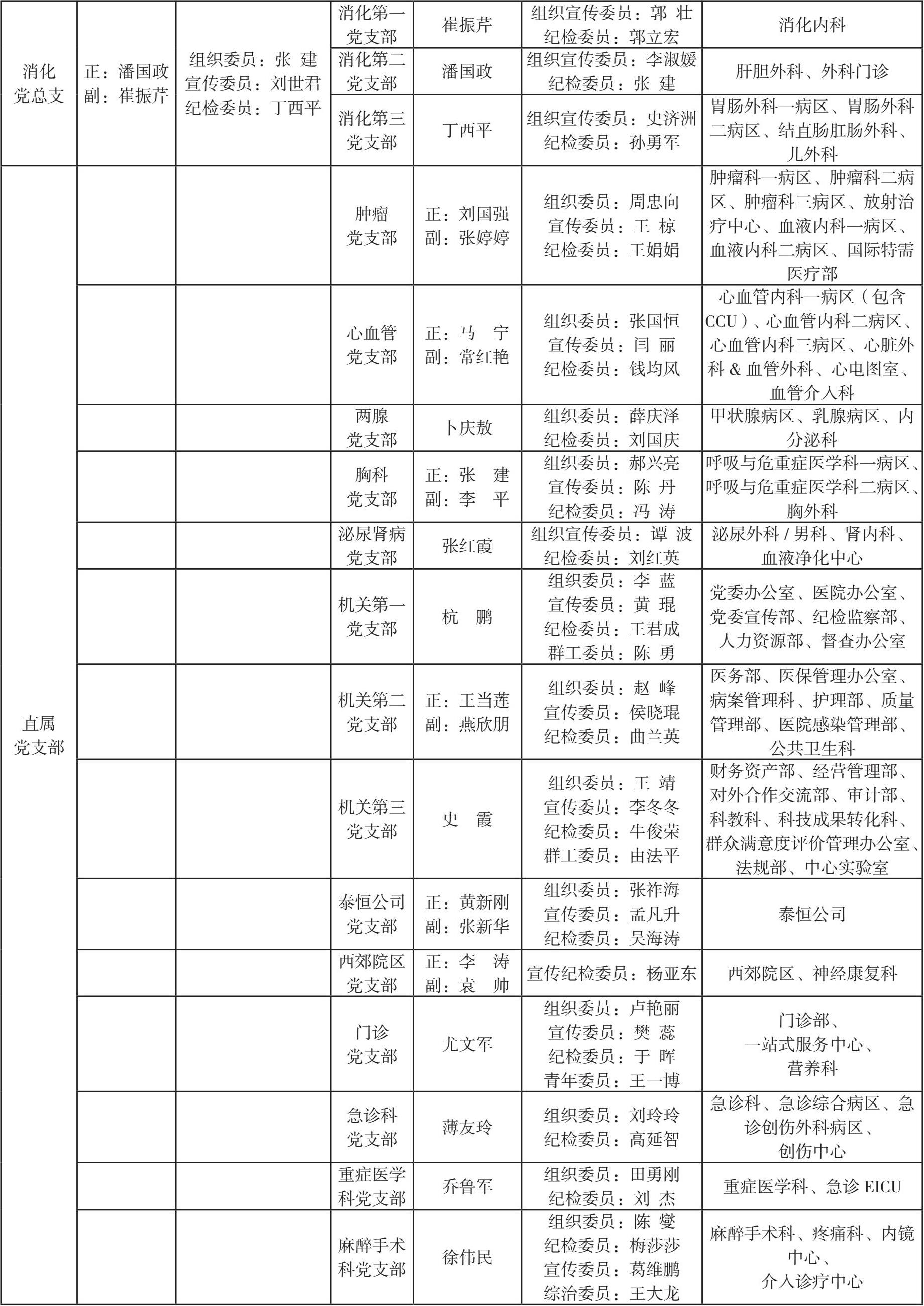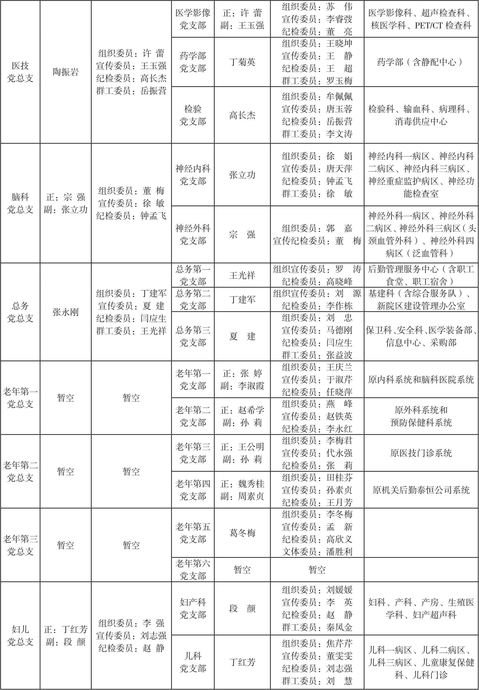 在医院不同发展时期,医院党委始终根据医院实际对基层党组织设置情况进行调整,确保基层党组织与科室设置相符合。尤其是进入新时代后,医院党委坚持把“支部建在学科上”,及时对基层党组织进行优化调整,确保党支部全覆盖。同时选优配强支部班子,落实“双带头人”机制,充分发挥党支部的战斗堡垒作用。