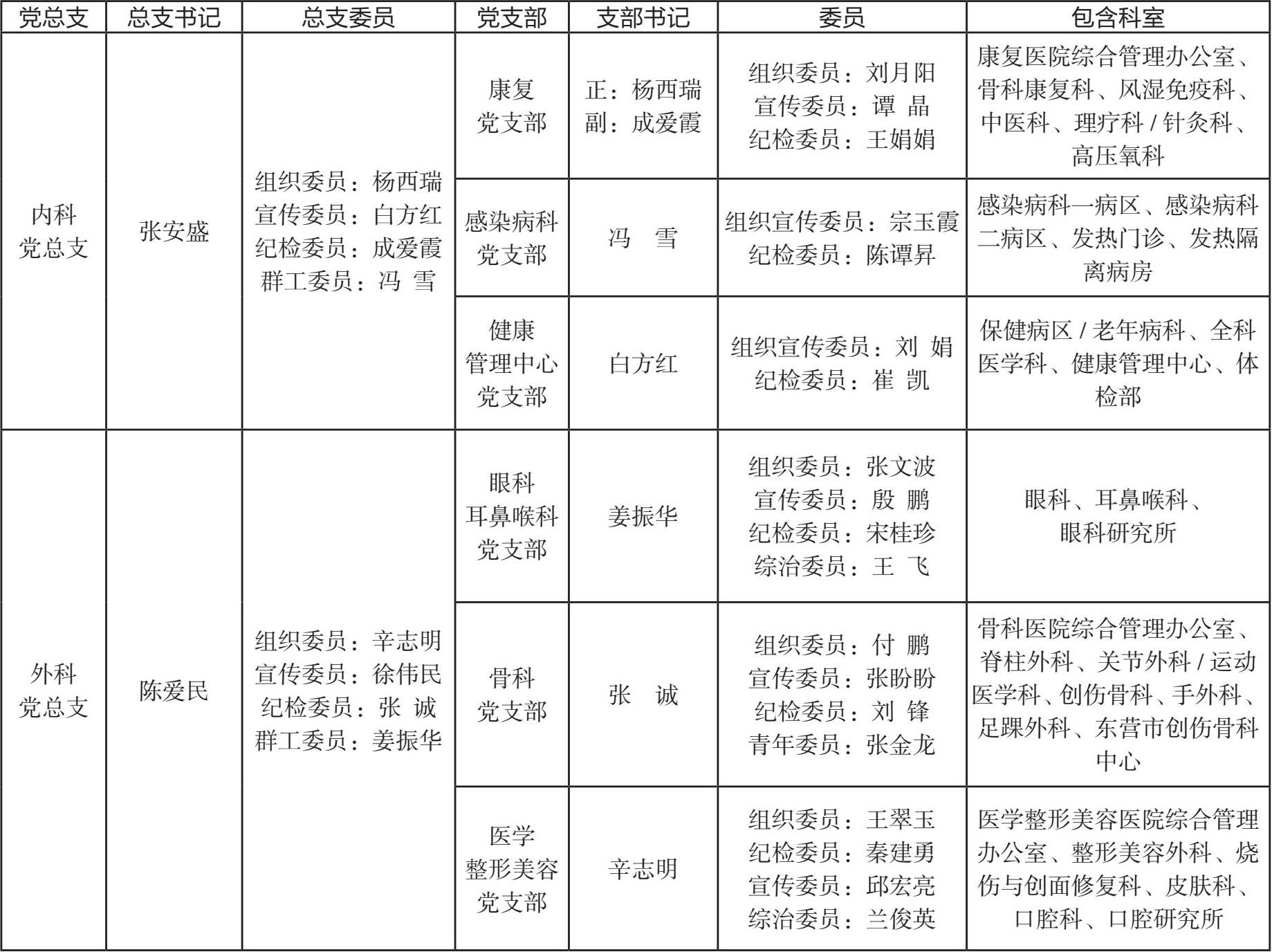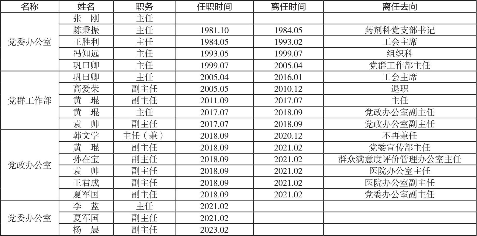 (1)概况 1972 年,组建政治处。1980 年,根据山东省的指示精神,为改善党的领导、精简机构、减少层次,胜利油田党委决定撤销各二级政治处,医院原来的办公室改为党委办公室。2005 年,医院改制后,撤销党委办公室、党委组织科、党委宣传科、工会、团委、计划生育办公室,整合 6 个部门成立党群工作部。2018 年 8 月 13 日,医院将医院办公室、党群工作部进行整合,成立党政办公室。2021 年 2 月 20 日,医院党委撤销党政办公室,成立党委办公室。