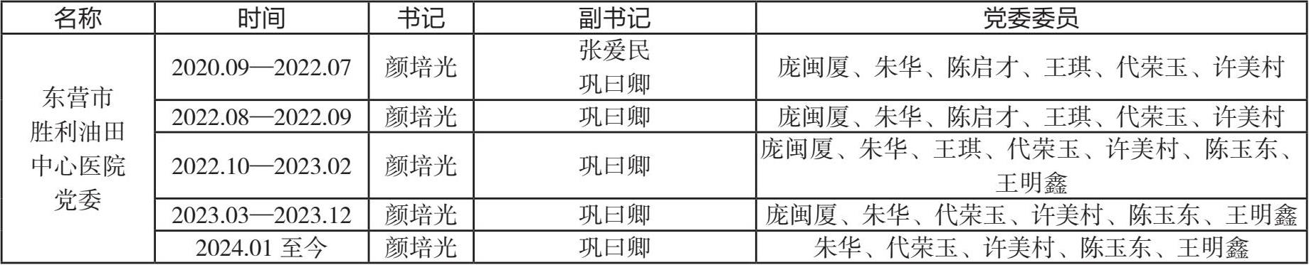 2020 年 9 月,按照国家剥离国有企业办社会职能工作安排,医院交由东营市政府管理,经东营市委决定,成立中共东营市胜利油田中心医院委员会,任命颜培光为党委书记,张爱民、巩曰卿为党委副书记。
