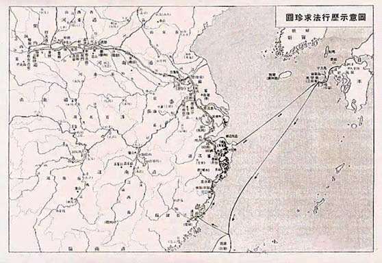 日本京都大学人文科学研究所砺波护教授所著《唐代的过所与公验》中记载:“圆珍一行于大中七年(853)九月二十八日从福建观察使(治所是福建都督府)辖内的海口镇经海路进入邻接的浙东观察使(治所是越州都督府)辖内的温州界内,通过江口镇到达横阳县,停留于县城内,十月二十六日得到横阳县发下的公验,向安固县进发。”
