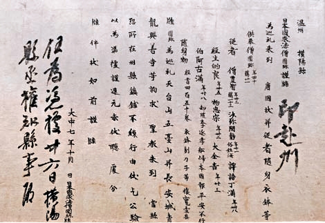 牒:圆珍为巡礼天台山、五台山,并长安城青龙、兴善寺等,询求圣教,来到当县。恐所在州县镇铺不练行由,伏乞公验,以为凭据。谨连元赤,伏听处分。”