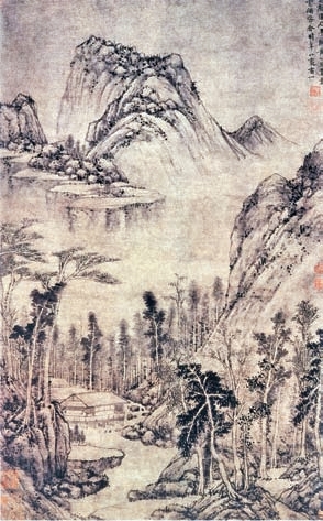 是这次变革的先驱,而完成这次变革的则是被称为“元季四大家”的黄公望、王蒙、倪瓒、吴镇。产生这次变革,主要有两方面的因素,其一是自宋代苏轼以来,文人画发展的影响;其二是工具材料的变化,主要是纸张逐渐取代了绢。他们用干笔皴擦代替了湿笔晕染,笔墨更为丰富起来。他们追求简淡高逸、苍落深秀的艺术情趣,全然不同于前代密实挺劲、淋漓奔放的风格。