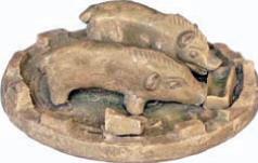 猪圈: 圈底为圆形,外周安有隔距相等的长条形栅栏。栏内二猪,一大一小,鬃毛直竖,俯首盯视食槽。全器施淡青釉,釉层均匀,光泽亦好,通高4厘米,圈径12厘米。