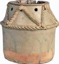 井: 口微外撇,宽沿,斜肩,最大腹径在中部,腹下略收至底。口沿模印网纹,网格稠密工整。肩部堆塑整齐匀称的结扎状绳索,设网坠,绳索中有六个孔洞。全器施青釉,釉汁匀净透亮,高 14 厘米,口径 9.5 厘米,底径11.5厘米。