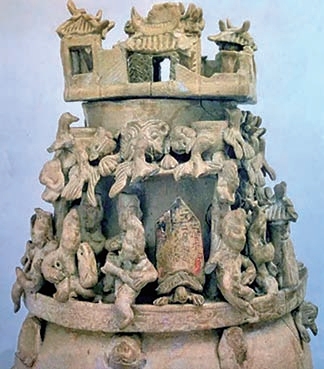 青瓷楼台堆塑罐: 腹部微鼓,饰有龙、龟、虎、蝙蝠和仙人骑麒麟等三排片状贴饰。罐有五口,居中罐口大而高,上覆盖着一组四出攒尖宫殿顶式盖。罐的颈部捏塑飞鸟,肩部塑有舞乐人像,相间堆塑龟趺驮碑一座,上面刻有“元康元年八月二日[造]会稽上虞”铭文。通观整体飞鸟簇拥,引颈展翅,人物百戏奏乐耍技,象征粮食盈仓,百鸟争食,人们喜庆丰收的欢乐场面。全器施青色釉,高 50厘米,口径13.4厘米。