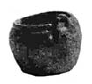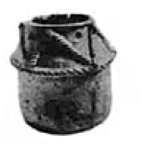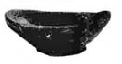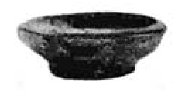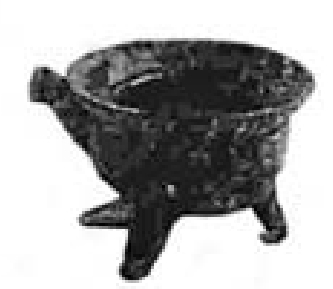鐎斗: 卷沿外撇、深腹、下装兽蹄形三足,口肩处安一微向外斜的短直把。全器施青釉,高 4.5 厘米,口径6.2厘米。