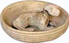 狗圈: 圈为盘形,平沿,直壁,平底,腹间有凸棱三圈。盘内塑一小狗,匍匐侧颈,昂首隆眼,四爪抓地,伺机出击。全器施淡青色釉,通高5.5厘米,圈口径10.5厘米,底径 6厘米。